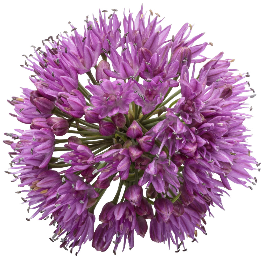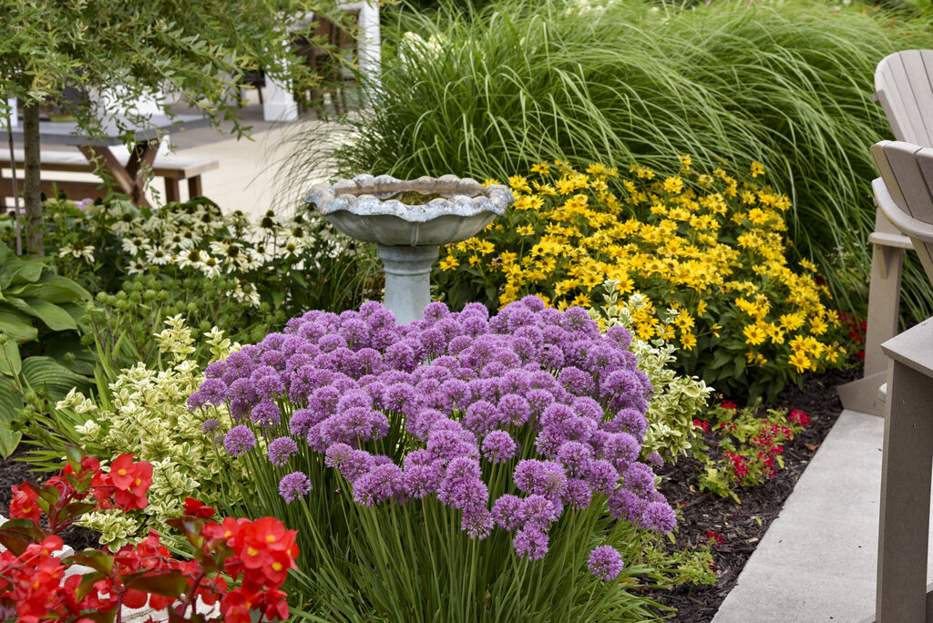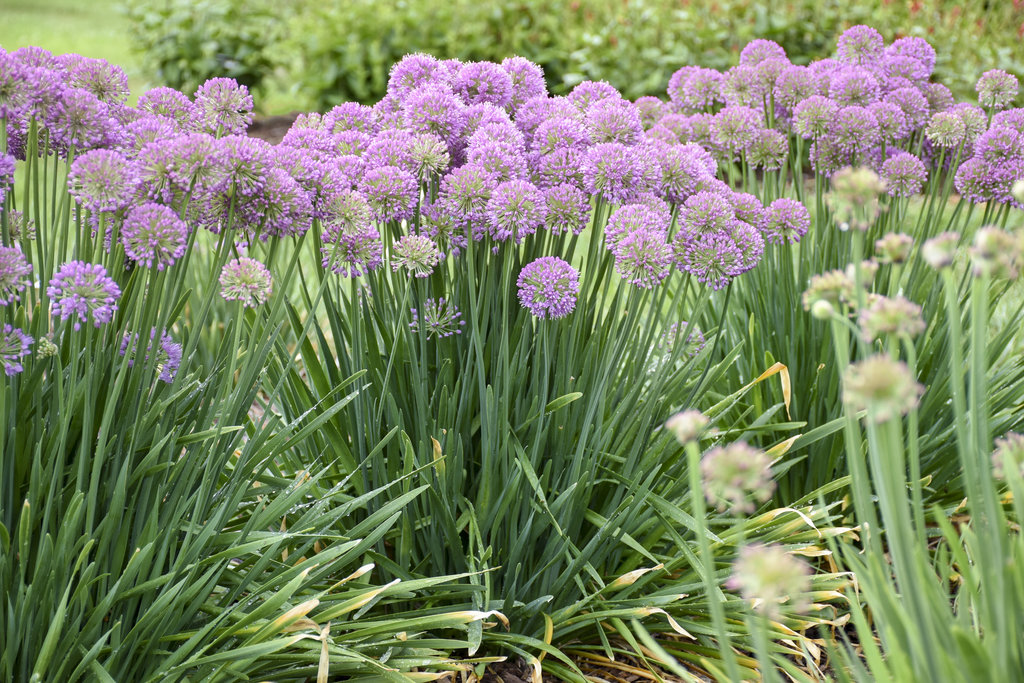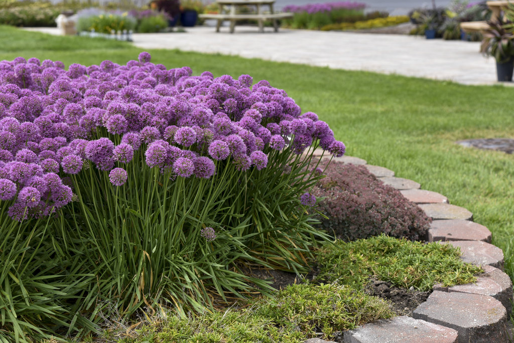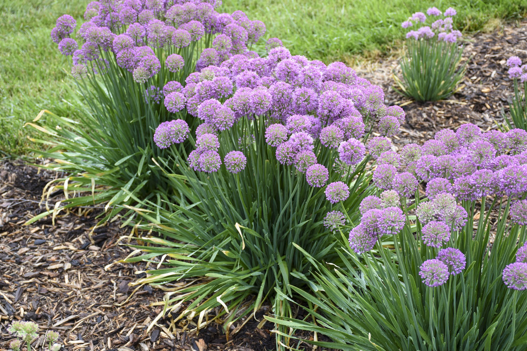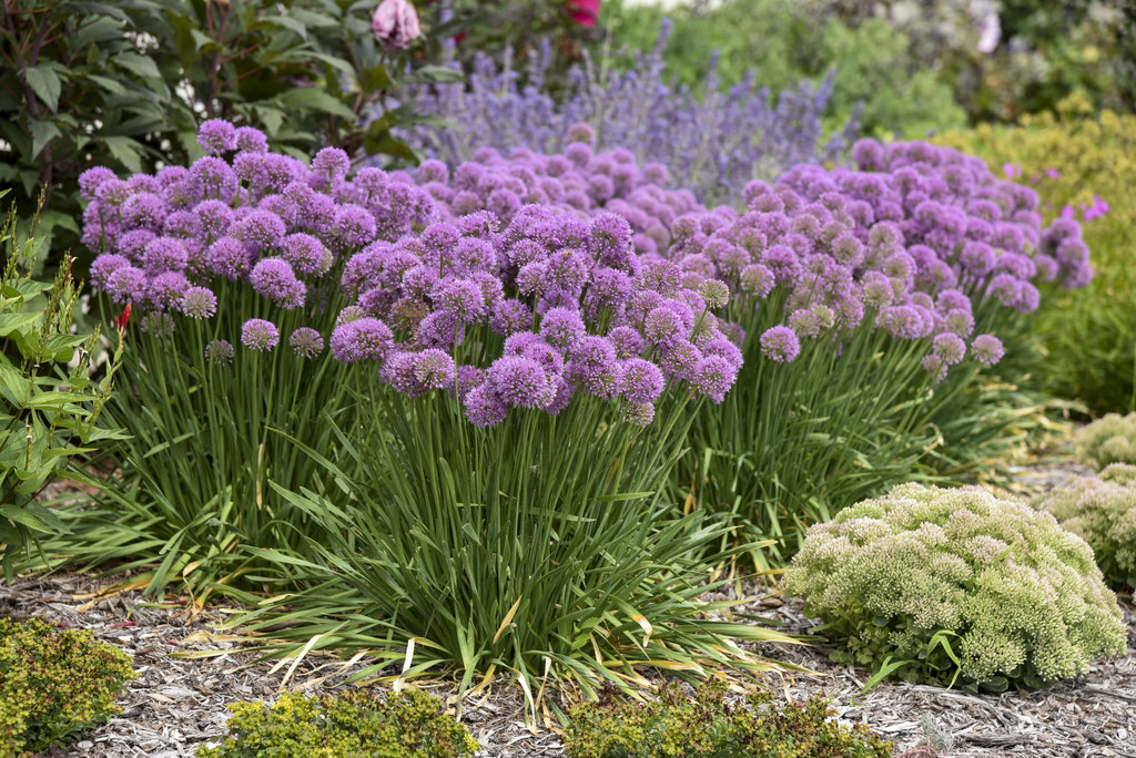 Displays globe-like, rosy-purple flowers mid to late summer that top attractive blue foliage. When crushed, the leaves will emit a smell of onion. The upright habit works as a thriller in containers and the landscape. It attracts pollinators and resists deer and rabbits.